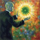 A blocky character in a suit stands amidst colorful flowers under a bright, pixelated sun. The scene is set in a vibrant, Minecraft-like environment with green trees in the background.