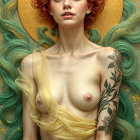 A serene young woman with flowing red hair lies in tranquil water, surrounded by lily pads. She wears a delicate green gown, radiating a peaceful aura against the lush, vibrant backdrop.