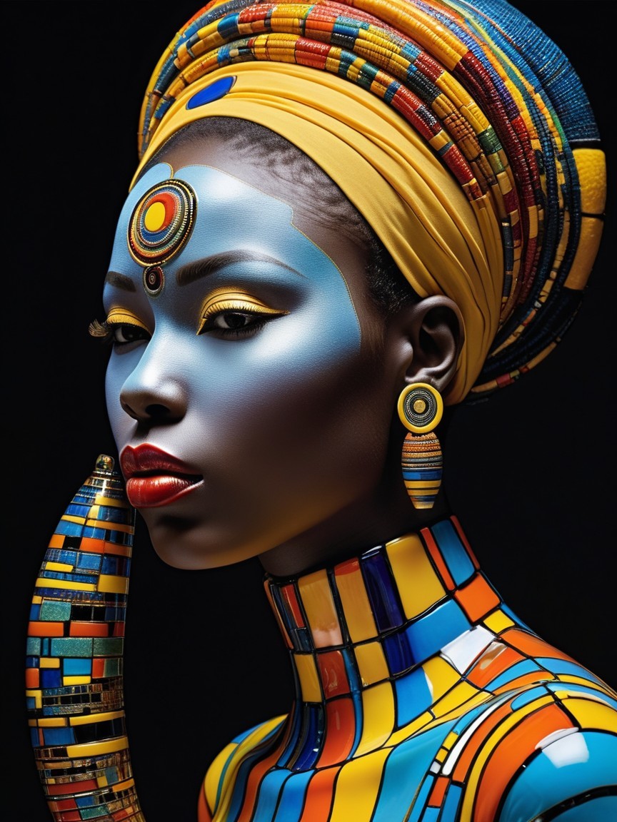 A close-up portrait of a woman with dark skin and light blue face paint from the bridge of her nose to her temples, against a black background. She wears a yellow headscarf with multi-colored wraps in red, blue, green, and orange, and a blue round bead in the