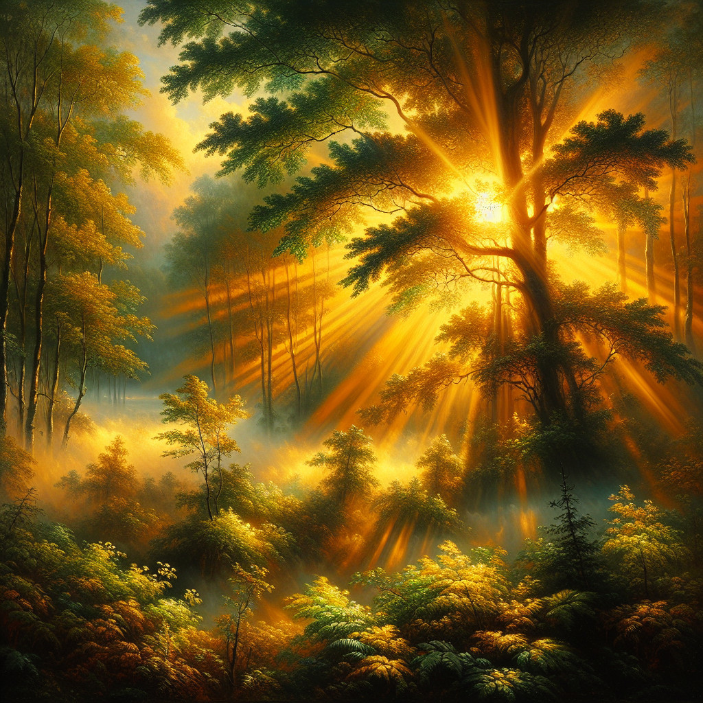 A serene forest scene bathed in golden sunlight. Sunbeams filter through tall trees, illuminating the lush greenery and creating a tranquil, enchanted atmosphere. Nature's beauty shines brightly.