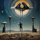 A whimsical scene shows a man in a suit holding strings attached to a floating house under a large moon. Surrounding him are tall, mushroom-like trees and quaint houses in a golden field.