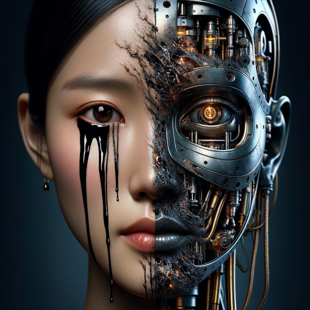 Female Figure with Half-Human, Half-Robotic Face Contrast