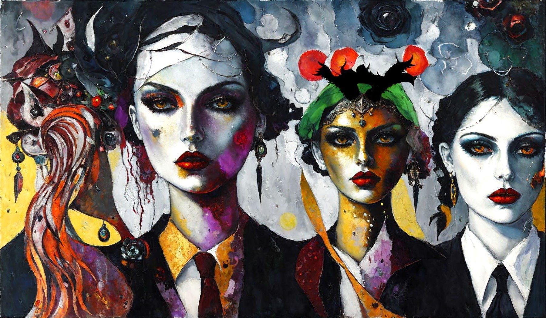 Three women with stylized makeup and unique headwear against an abstract, colorful backdrop.
