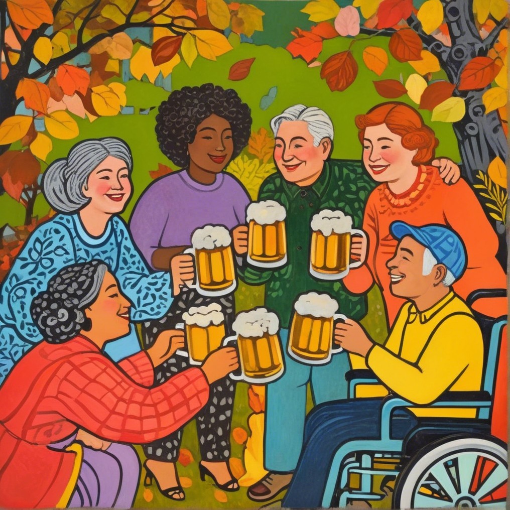 A joyful autumn scene where friends of diverse backgrounds gather under a canopy of golden leaves. They raise foamy mugs of beer, celebrating togetherness, resilience, and the season’s abundance. The warm palette and stylized lines exude harmony, unity, and festive spirit.