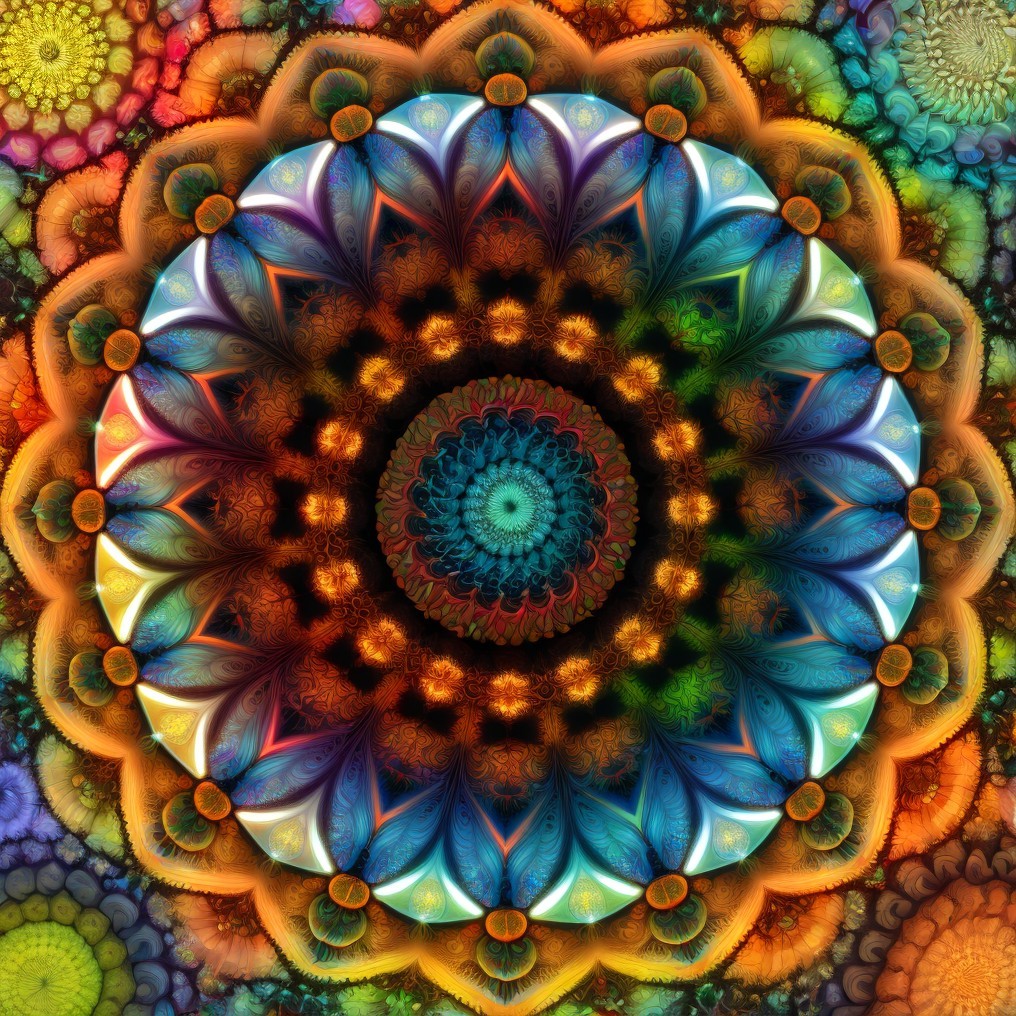 A vibrant, kaleidoscopic fractal pattern with intricate floral motifs and a spectrum of luminous colors emanating from a central point.