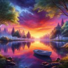 A serene lake at sunset, surrounded by lush trees. A small boat rests on the calm water, reflecting vibrant pink, orange, and purple hues in the sky, creating a tranquil and picturesque scene.