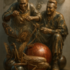 Two elderly craftsmen joyfully manipulate intricately designed mechanical insects, showcasing their artistry amidst a backdrop of butterflies, creating a whimsical scene of creativity and nostalgia.