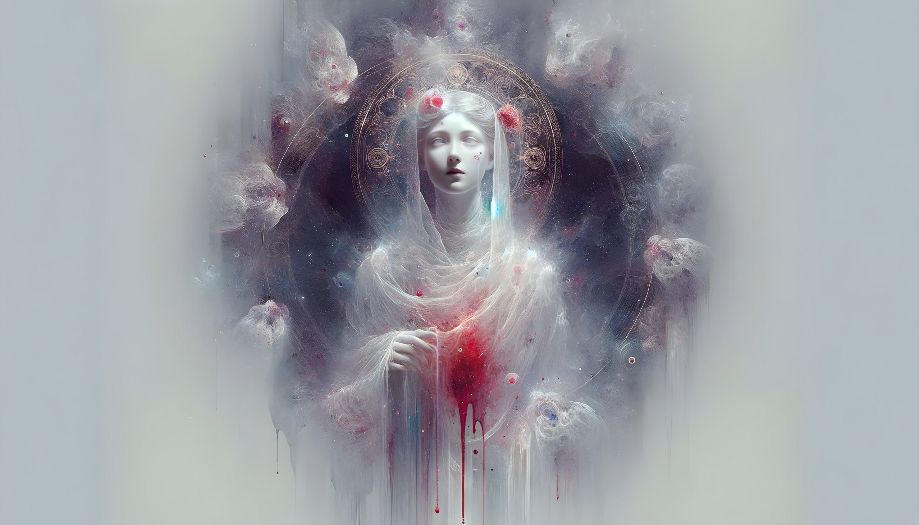 Ethereal woman with a halo, surrounded by cosmic elements and hints of red, evoking a mysterious, otherworldly presence.