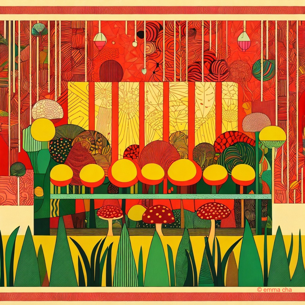 A vibrant, abstract illustration featuring mushroom motifs, patterned background, and a colorful palette with a retro feel.