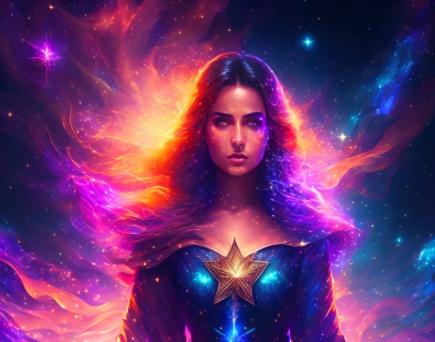 Cosmic-themed digital artwork of a woman with starlit hair in vibrant galaxy setting
