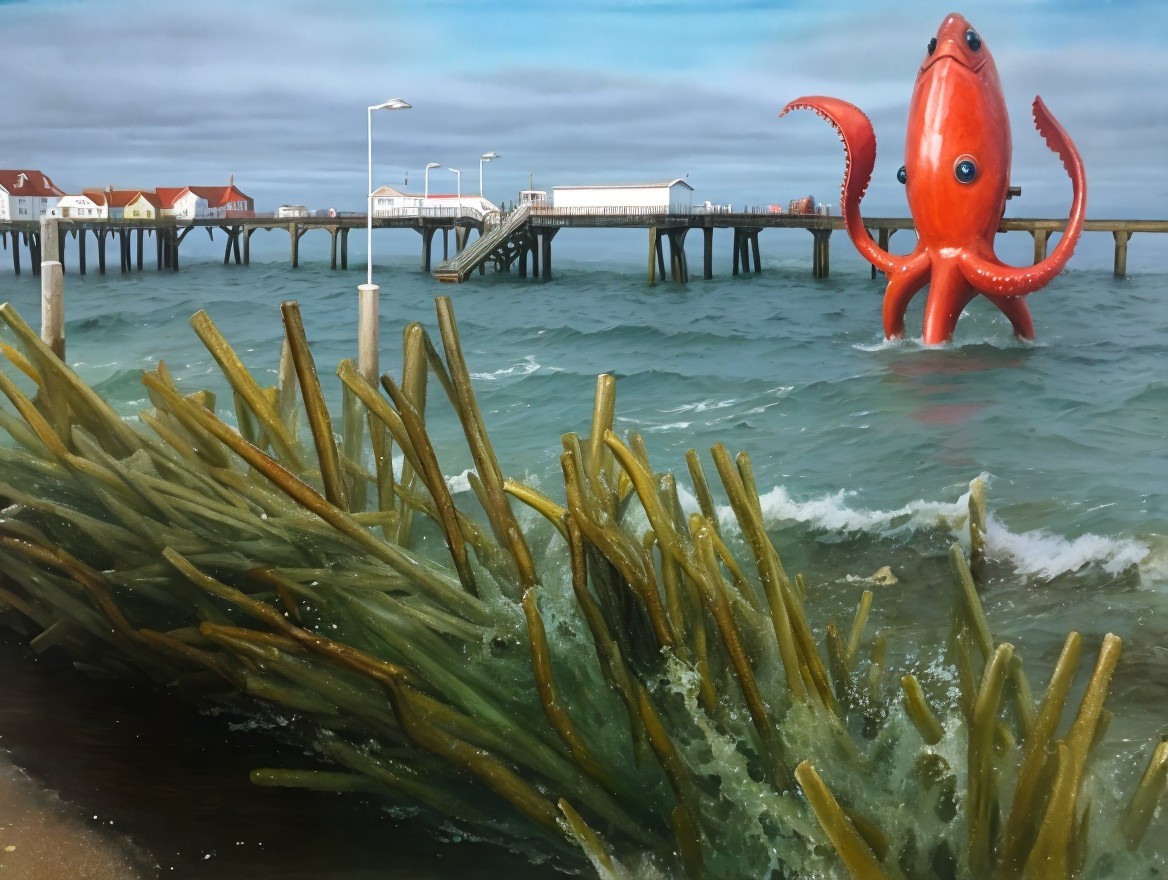 A vivid seaside scene features a giant red octopus emerging from the waves near a pier, with wooden debris in the foreground and a dramatic sky above, blending realism and fantasy.