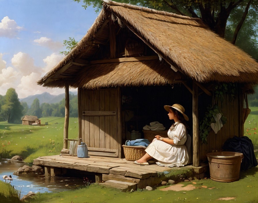 Prompt: A small hut by a stream. A woman is sitting by the water washing clothes. A washing line is attached to the hut on which clothes are hanging to dry. A sheepdog sits next to her and watches. Carl Spitzweg