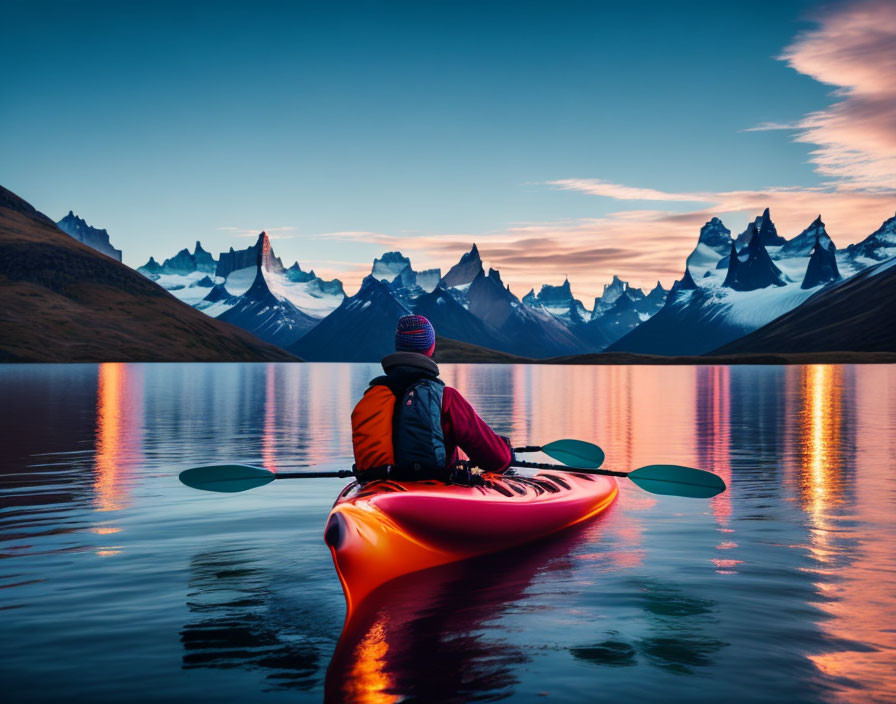 Prompt: "Paisajes desde las alturas, se puede ver un hermoso lago de aguas claras. Sobre el anda un joven hombre en kayak rojo. El agua tienen reflejos del atardecer en la patagonia"