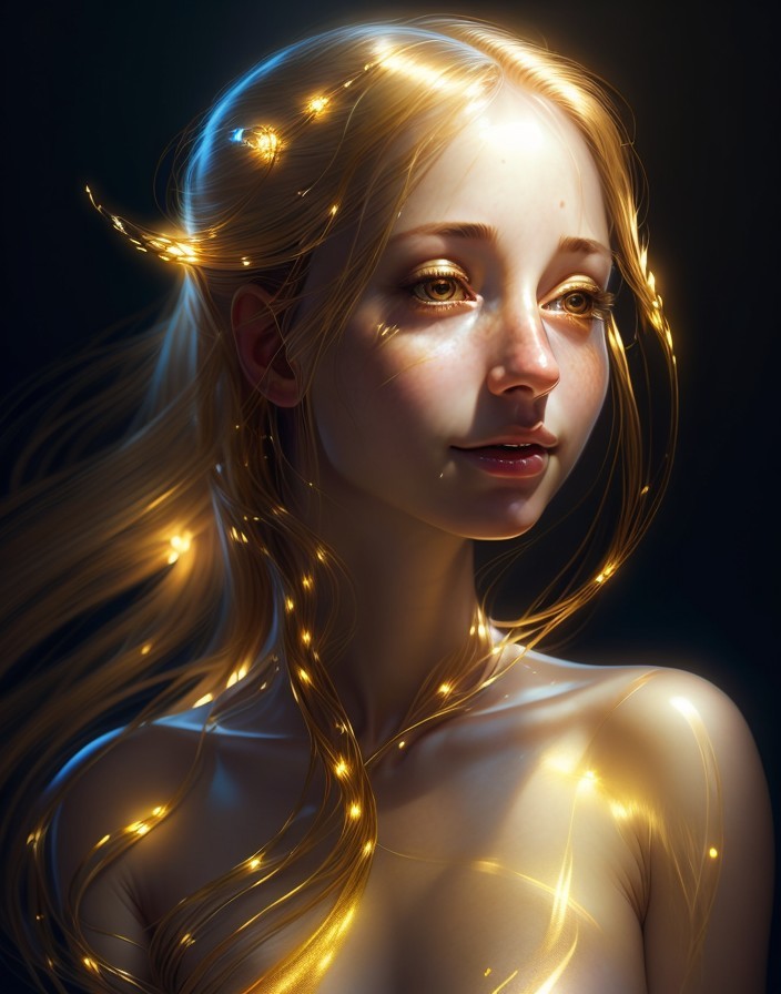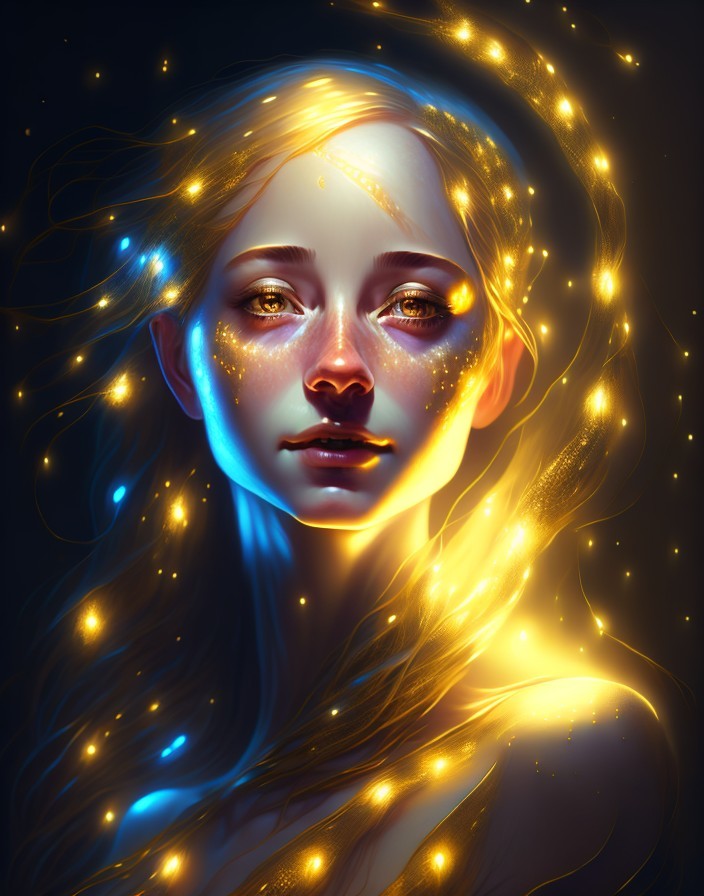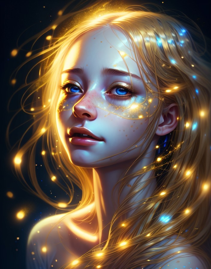 A digital artwork depicts a young girl with sparkling blue eyes surrounded by glowing lights, creating a magical atmosphere.
