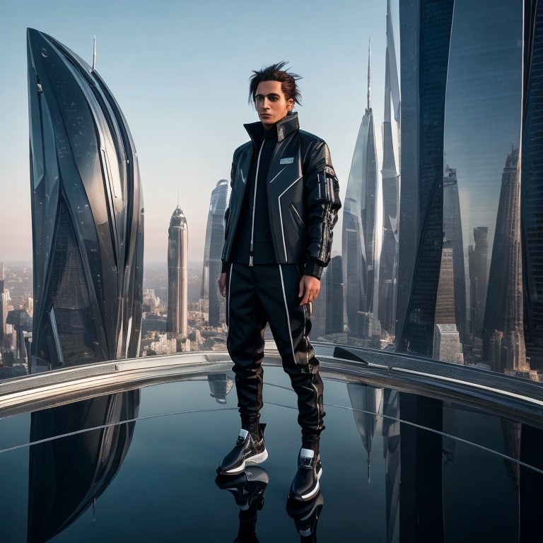 Generate an intriguing scene featuring a man who has time-traveled from the future and possesses the extraordinary ability to fly. Envision him soaring through the sky with grace and ease. Pay attention to the futuristic elements in his clothing, incorporating advanced designs in his jacket and pants. The attire should reflect the fashion aesthetics of his time period. Picture a cityscape or futuristic setting as the backdrop, with sleek buildings and advanced technology. Emphasize the details of his flight and clothing, capturing the essence of a futuristic individual seamlessly blending into our present time while showcasing his unique abilities and style.
