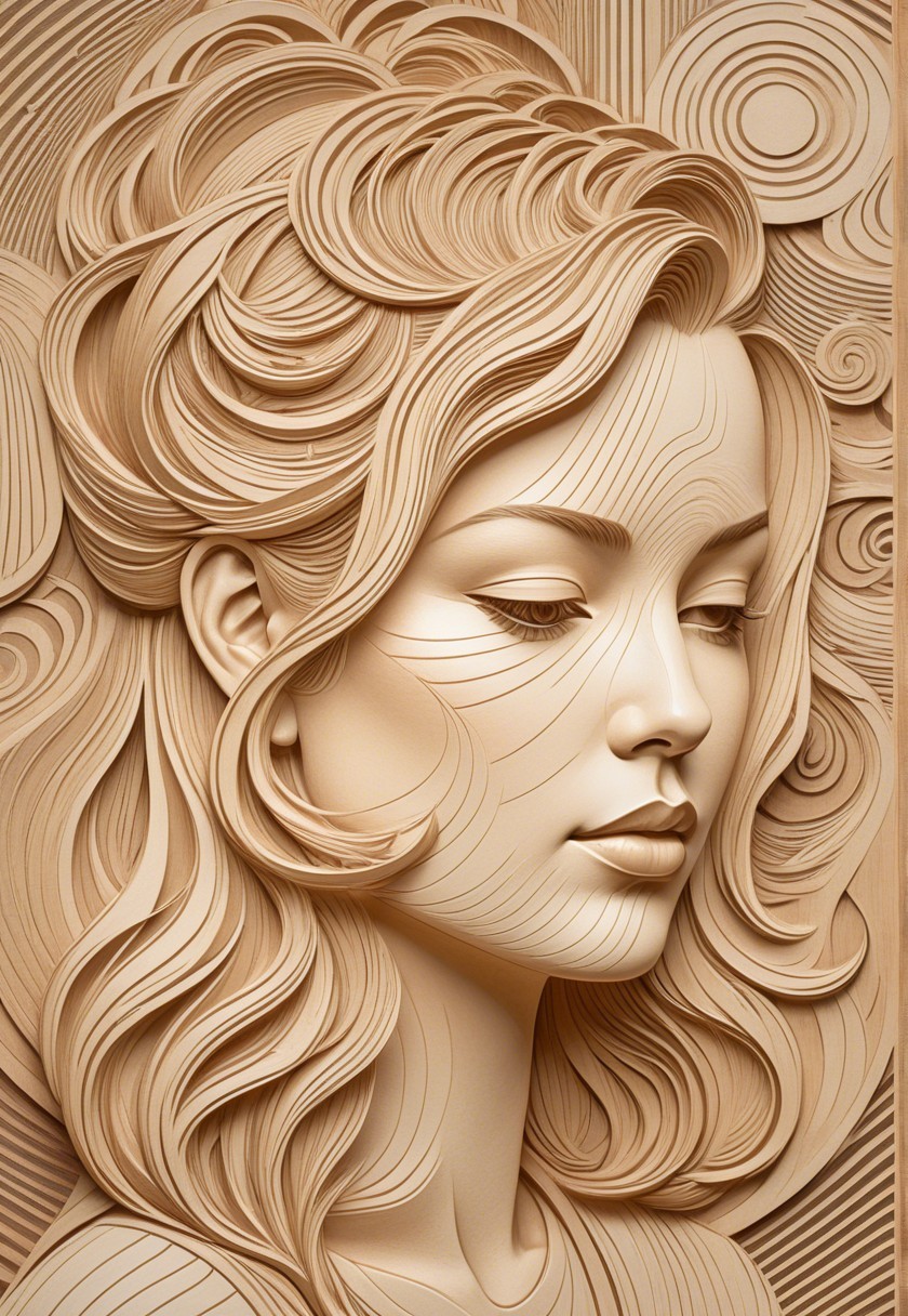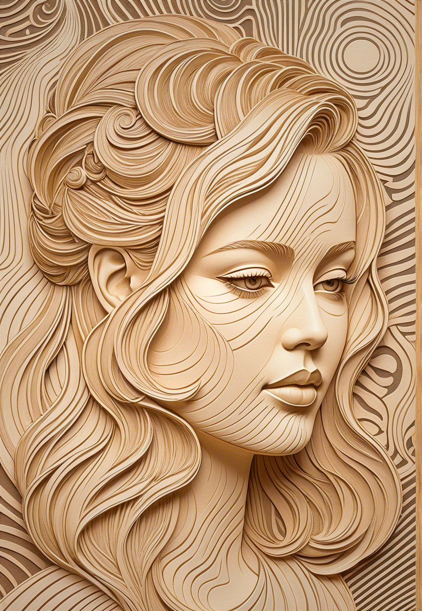 A stunning relief sculpture features a serene, beautifully styled female face. Intricate swirls and layered textures create a captivating three-dimensional effect, highlighting elegance and artistry.