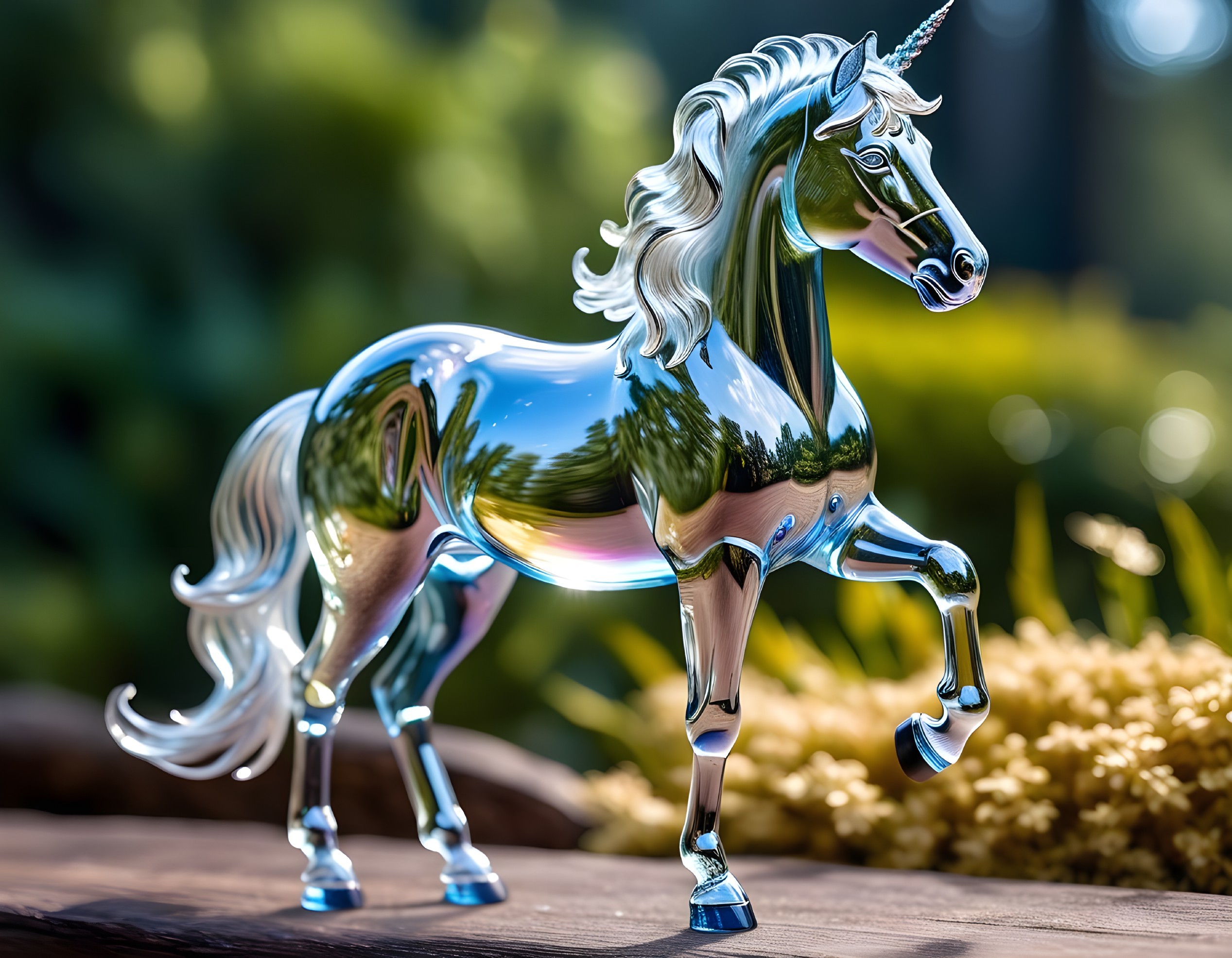 A shimmering, crystal-like unicorn figurine stands majestically, reflecting sunlight and surrounded by lush greenery, showcasing intricate details and a magical aura.