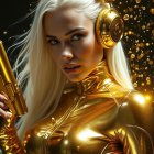A stunning figure with long, flowing silver hair wears ornate golden accessories. Her intricate, metallic outfit reflects a serene landscape, blending fantasy and elegance in a captivating scene.