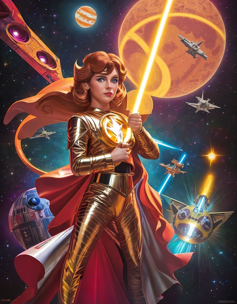 A stylized female warrior in a golden suit holds a glowing sword with spaceships and planets in the background.