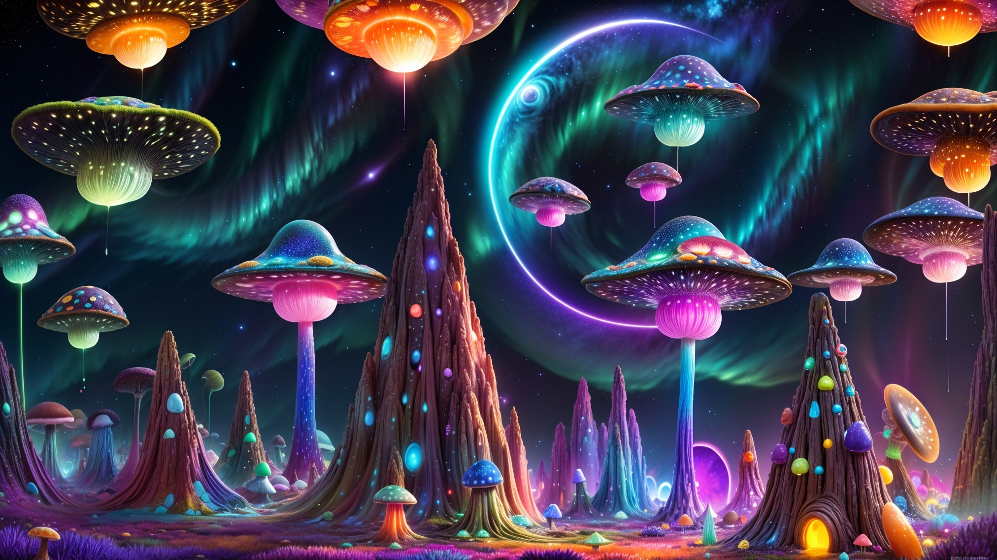 A whimsical fantasy landscape with oversized glowing mushrooms, a vibrant night sky, and a large moon.
