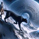 A digital painting depicts a woman with long silver hair, dressed in a fur coat, black bra, and black bottoms, wearing black furry boots, walking alongside a black panther on a snow-covered mountain. In the background, a large, detailed celestial body with intricate patterns and glowing blue rings surrounds a