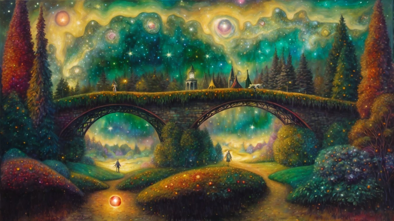 A vibrant, dreamlike landscape features a bridge arching over a shimmering river, surrounded by colorful trees and a starry sky, evoking a sense of wonder and tranquility.