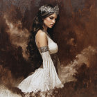 A stunning fantasy art piece featuring a regal woman in a flowing white gown, adorned with intricate armor and a crown, set against a mystical backdrop of moons and dark landscapes.