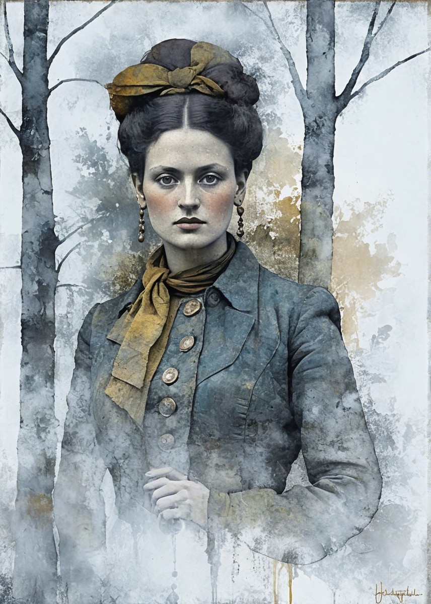The artwork features a woman with striking makeup and a vintage hat, surrounded by a muted landscape of trees, blending realism and abstract elements in warm earthy tones.