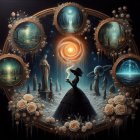 Woman in Black Gown Before Ornate Magical Portal