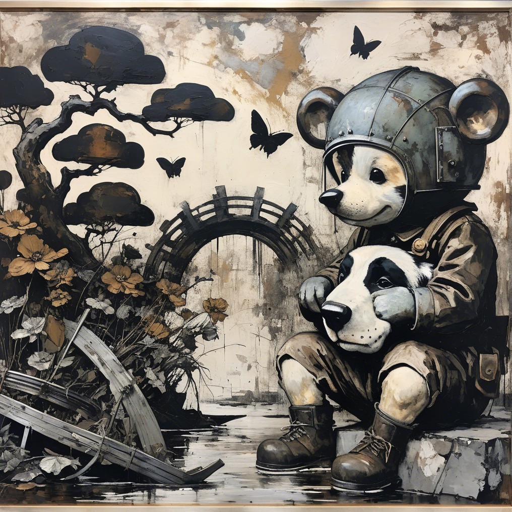 An anthropomorphic dog in a worn bear-helmet sits in quiet solitude, embracing a cat amidst a decayed, ruined setting. The scene conveys a sense of stillness, loss, and the lingering comfort of companionship in a broken world, evoking themes of abandonment and survival.