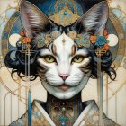 Create an art piece featuring a majestic cat with a beautifully detailed face, incorporating decorative elements inspired by Art Nouveau. The cat should have striking green eyes and a mix of brown and black fur patterns. Surround the cat's face with intricate floral and geometric designs, using a color palette of gold, teal, and coral. The background should be a soft, muted color with circular patterns, enhancing the ethereal and whimsical feel of the composition. Include hints of Eastern-inspired artistic elements, such as stylized waves or delicate cherry blossoms.