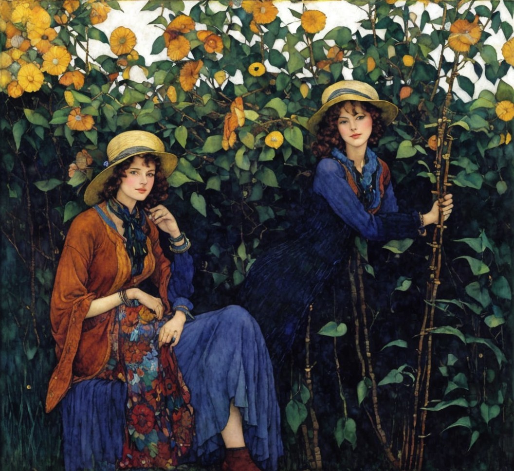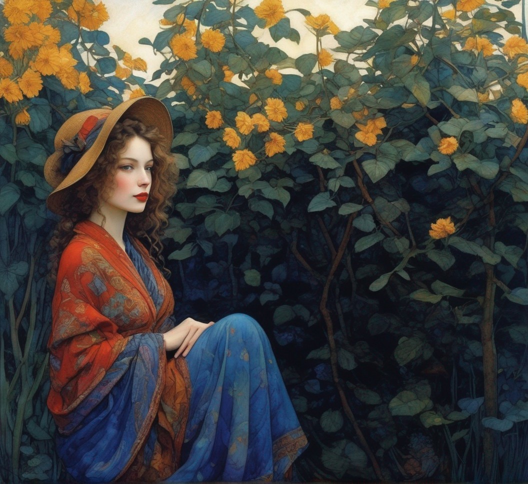 An illustration of a pensive woman in vintage attire before a scenic backdrop with a castle under a large, glowing moon.