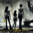 Three figures in sleek outfits stand before a futuristic spacecraft, with one resembling a cat plush toy nearby. The setting is a high-tech environment illuminated by a distant moon.