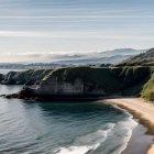A stunning coastal landscape features lush green cliffs rising sharply above golden sandy beaches, with gentle waves lapping at the shore, framed by distant snow-capped mountains.
