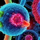 The image depicts a vibrant, stylized representation of cells and microorganisms. Various colors illustrate intricate structures and interactions, showcasing the complexity of biological systems at a microscopic level.