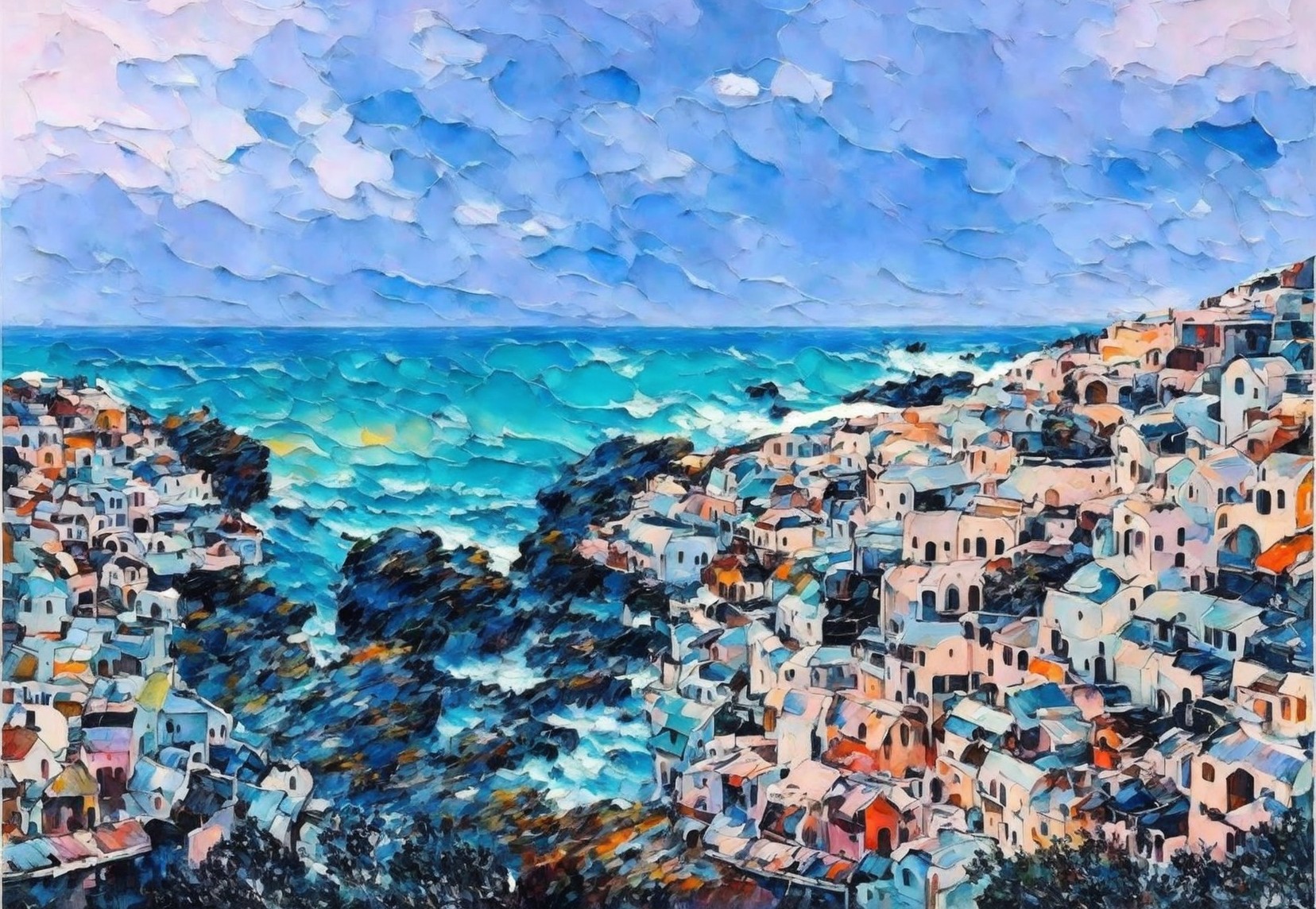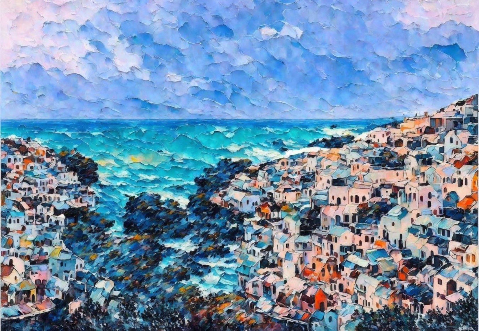 A colorful, impressionistic painting of a coastal village with clustered houses overlooking a turquoise sea under a textured sky.
