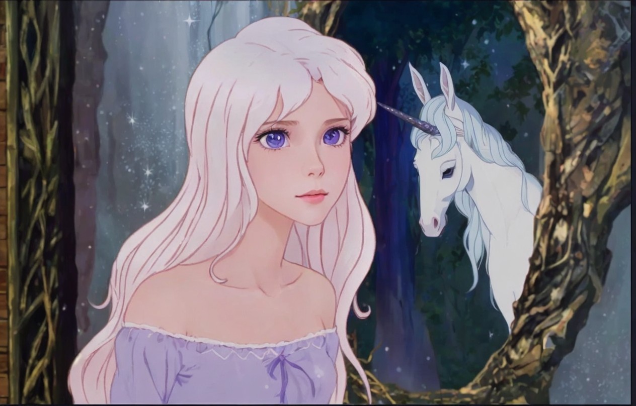 A serene fantasy scene features a young woman with long, flowing white hair and captivating purple eyes, gazing softly as a unicorn stands behind her in a mystical forest setting. inspried by The Last Unicorn