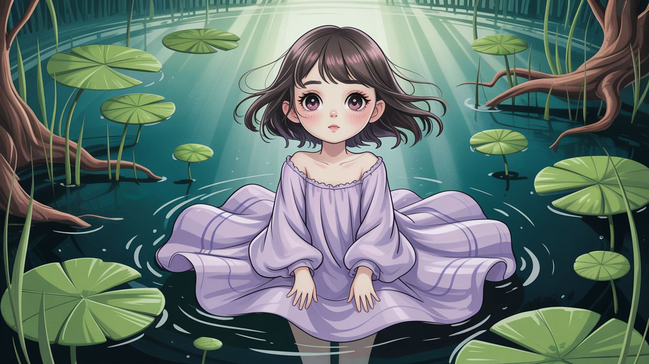 A whimsical scene unfolds as a charming girl in a cute anime-style nightgown explores a serene underwater bog. Surrounded by vibrant aquatic plants and softly glowing creatures, she embodies curiosity and wonder.