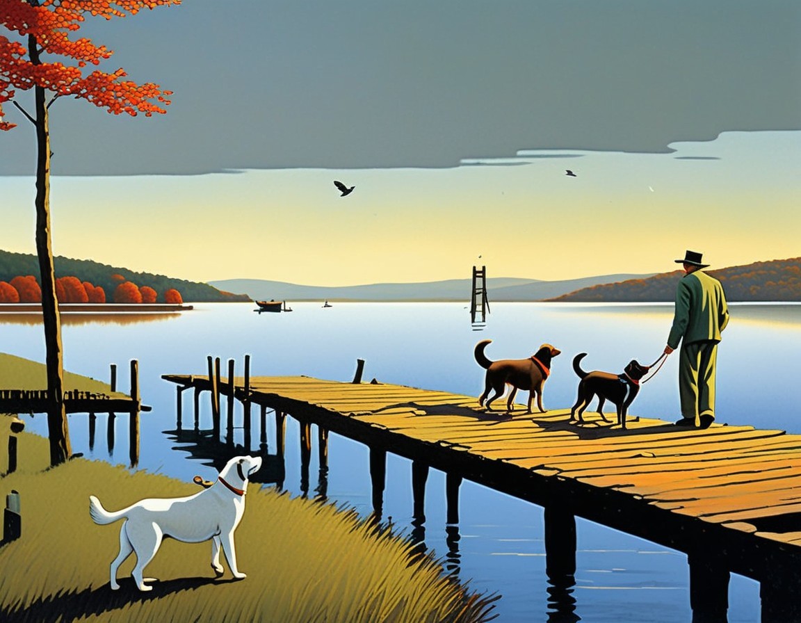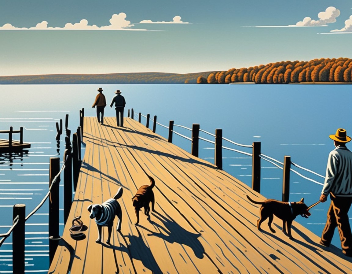 Two people and three cats walk on a wooden pier extending into a tranquil body of water, under a clear sky with clouds on the horizon.