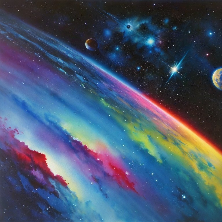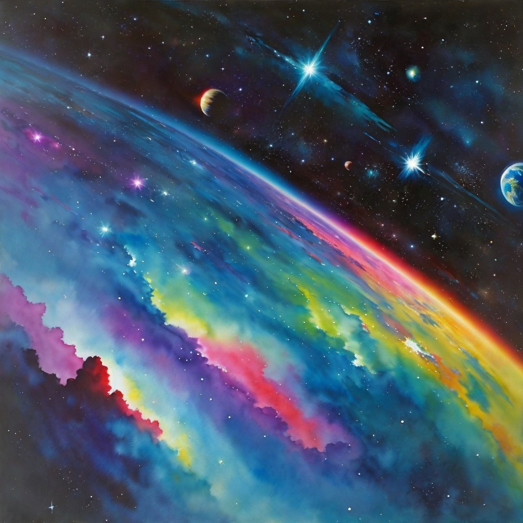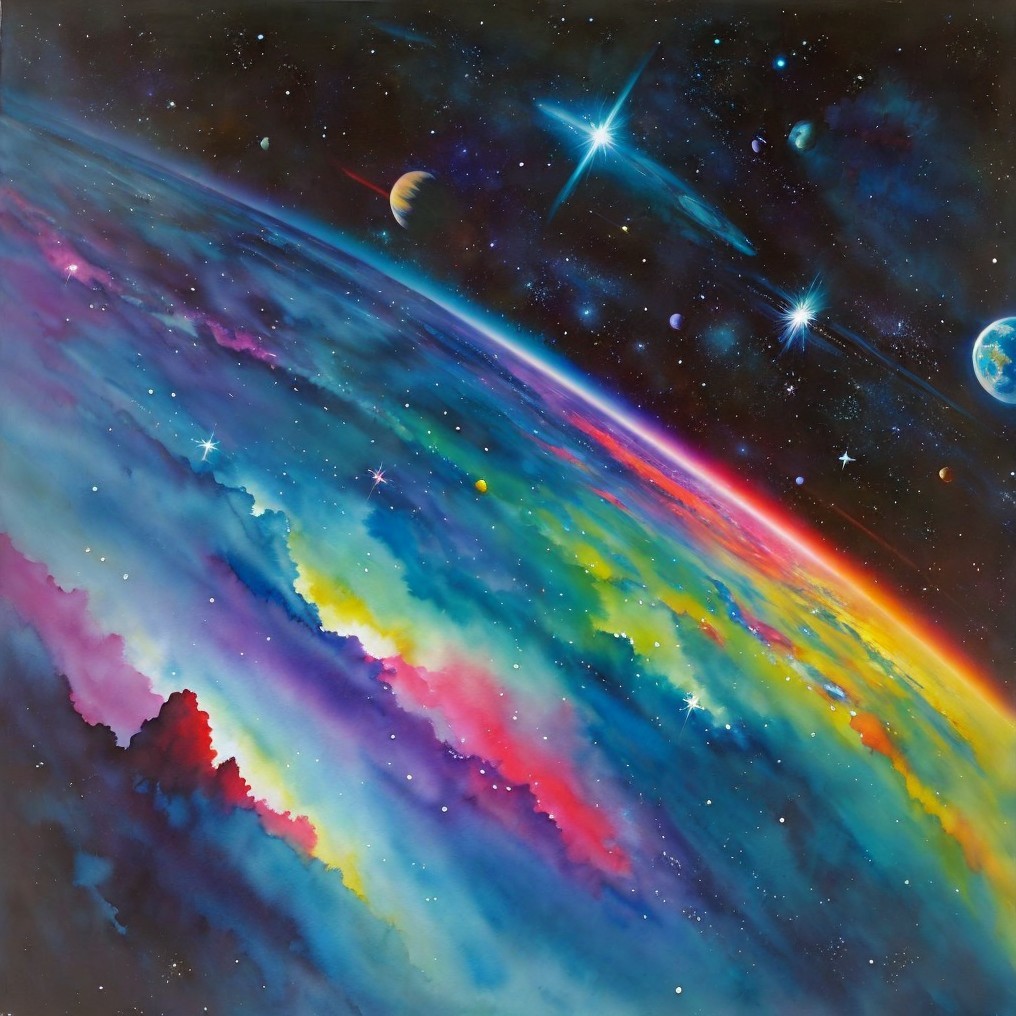 Prompt: space the final frontier, explore new worlds where no one has been before:watercolor, wet on wet, splash effect, splash, double exposition, bright touches of color that capture the effect of light and movement in the present moment, style of Tsuchiya Koitsu, Salvator Dali