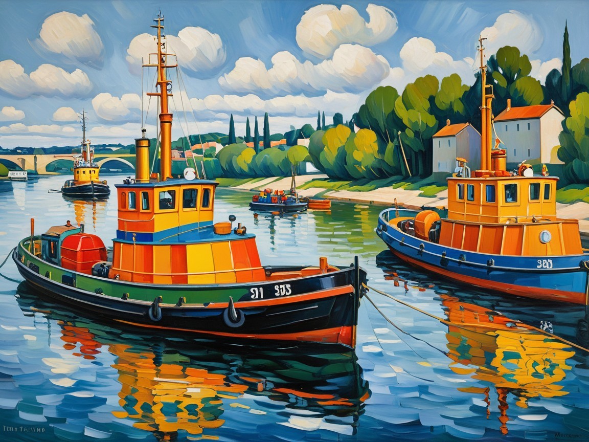 Colourful tugboats docked along a serene river, with lush greenery and sunny skies reflected in the water, creating a lively and inviting maritime scene.