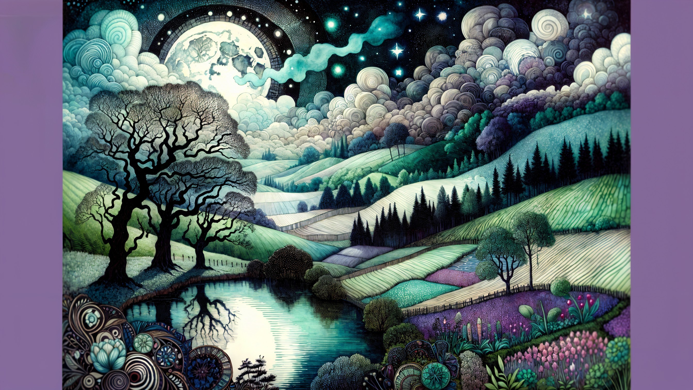 A serene landscape features a reflective pond surrounded by lush greenery and colorful flowers. A large tree stands majestically, under a starry sky with swirling clouds and a glowing moon.