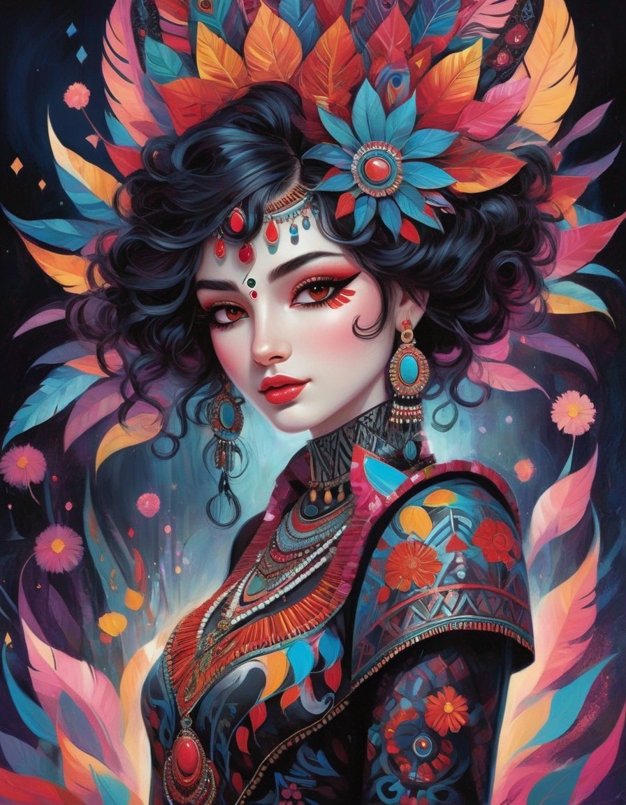 + Prompt:Create an illustration of a young woman with pale skin and enchanting, large red eyes with black, voluminous, wavy hair cascading down her shoulders. She has a slender face adorned with symmetric tribal-like face markings around her eyes and forehead, along with a bindi. Her lips are luscious and tinted pink. She wears a large, intricate headdress consisting of vibrant, stylized feathers and multi-colored, blossoming flowers with jewel-like embellishments at the center. Two turquoise earrings dangle from her ears, matching the tones in the headdress.