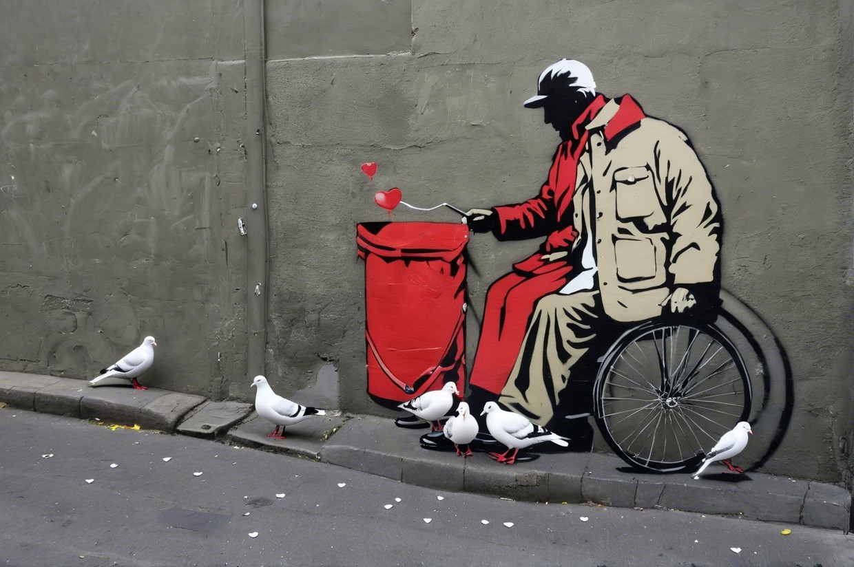 The mural depicts an elderly couple, with the woman feeding pigeons while the man sits in a wheelchair. Red hearts float around them, symbolizing love and connection amidst a urban backdrop.