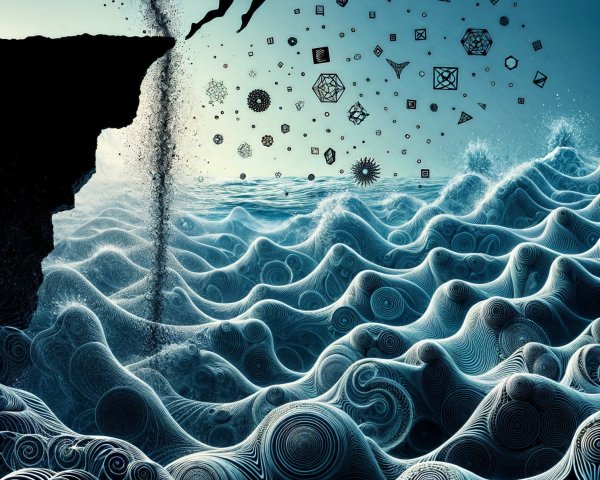 A surreal scene features a skeletal figure elegantly poised to eat, surrounded by fragmented food items and a bowl. The composition blends elements of life and decay, evoking a haunting beauty.