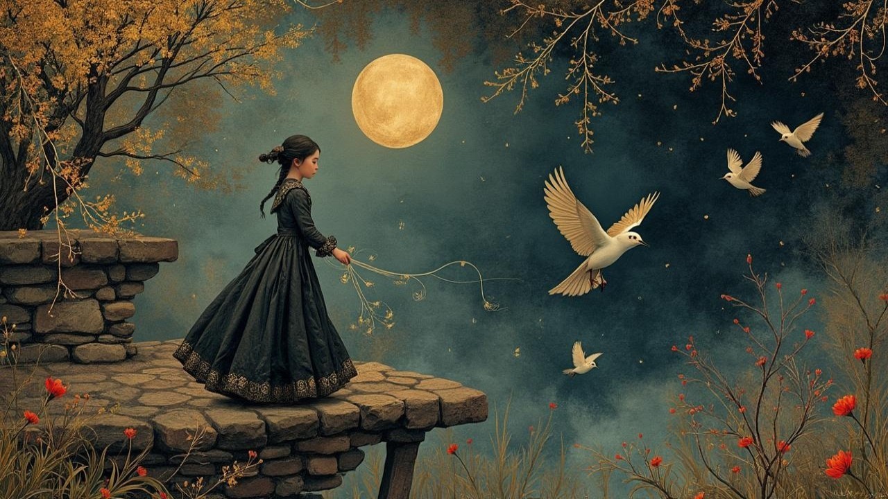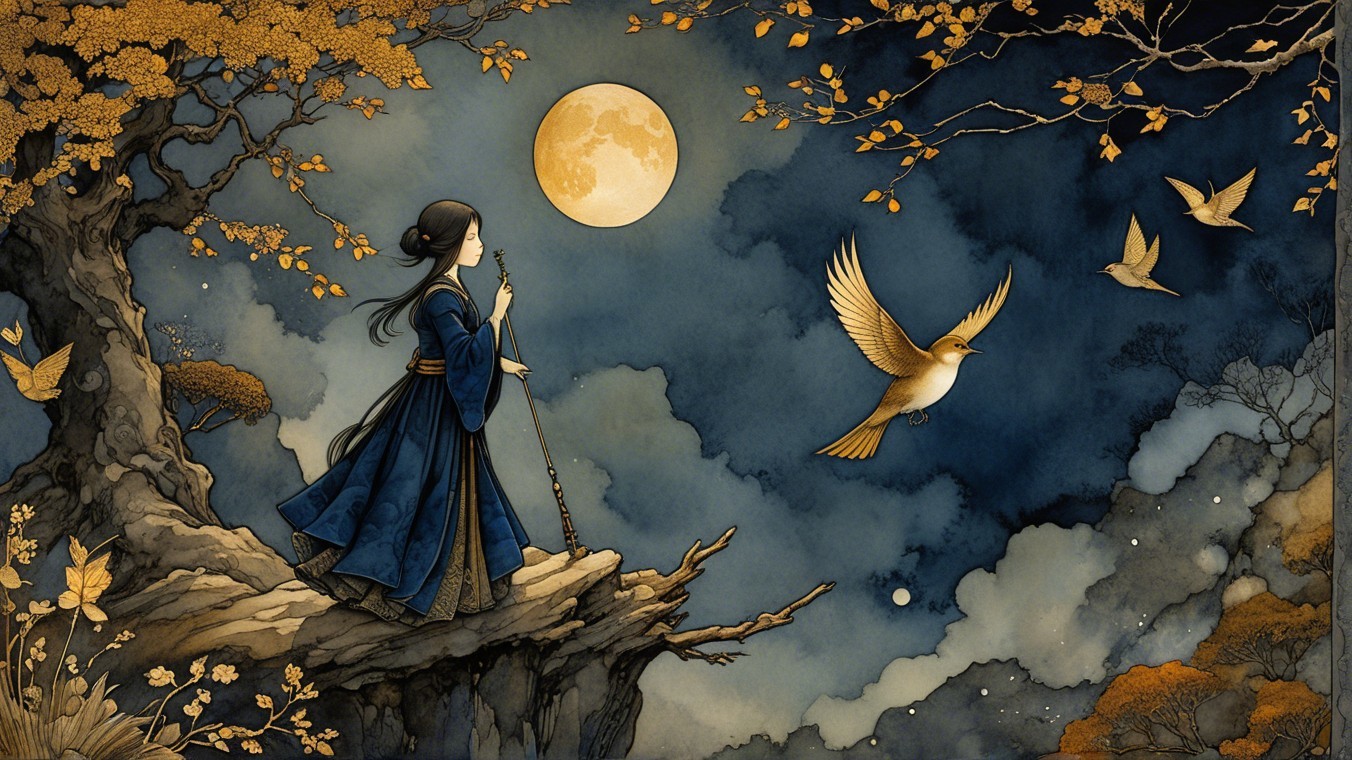 Legend of the Girl and the Singing Nightingale, Medieval Japanese Artists Sumi-e Style, Velvet Black, Velvet Indigo, Shabby, Dull Gold, Amber Gray, Golden Ratio, Surreal Fantasy, Elegant, High Definition Ultra Fine 3D Line, Zenangle Style, Watercolor Patchwork , Arthur Rackham Style, Paul Kidby, Gediminas Prankevicius, Jacek Jerka, Extremely Detailed, Intricate, Thoughtful, HDR, Fractal, Beautiful, Award Winning, Fantasy Look, Fantasy, Crisp Quality
