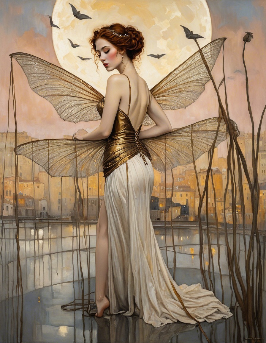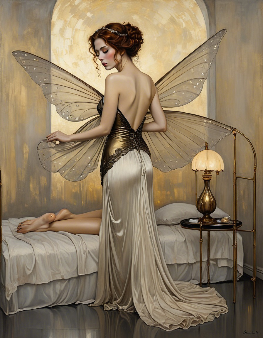 A woman in an elegant golden gown stands with her back to the viewer, framed by a serene room with a softly glowing lamp and a beautiful artwork on the wall, exuding grace and sophistication.