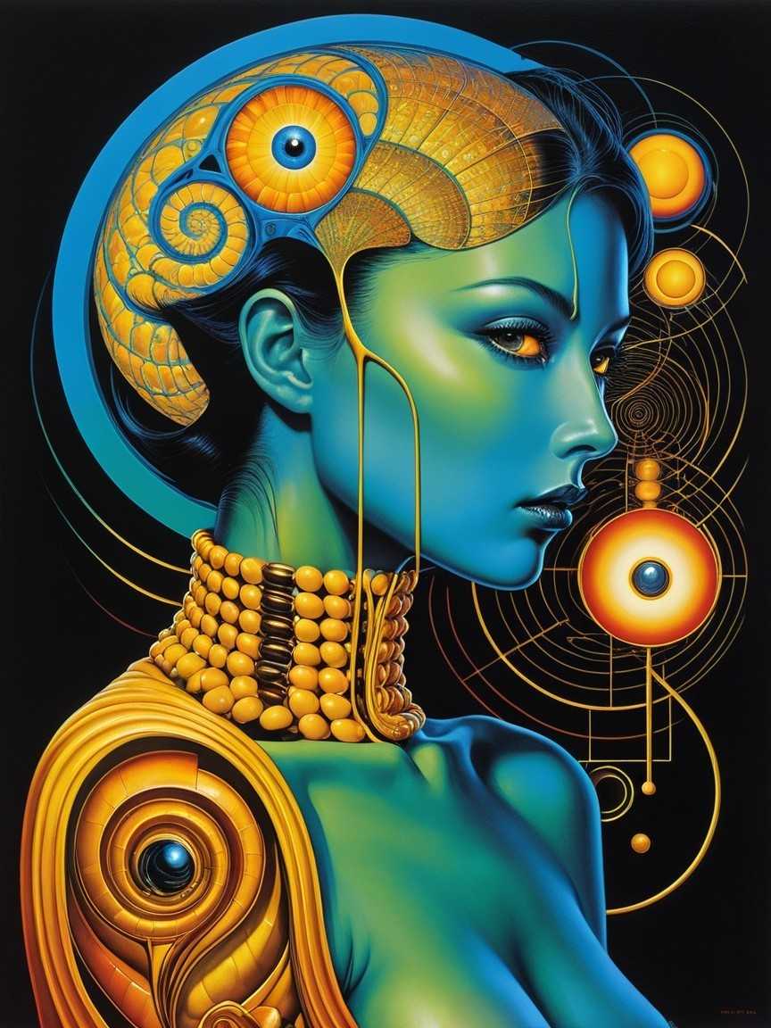 With surrealist elements in the style of Junji Ito, Henry Patrick Clarke, Igor Morski, Georgia O'Keefe, Gediminas Pranckevicius, Boris Vallejo and Naoto Hattori. Ink, pen and oil. Lurid, rectangluar neon colour palette. Sharp contrast. Labial and vulvic Ensure all significant elements are fully within the boundaries. [[[nudity]]].