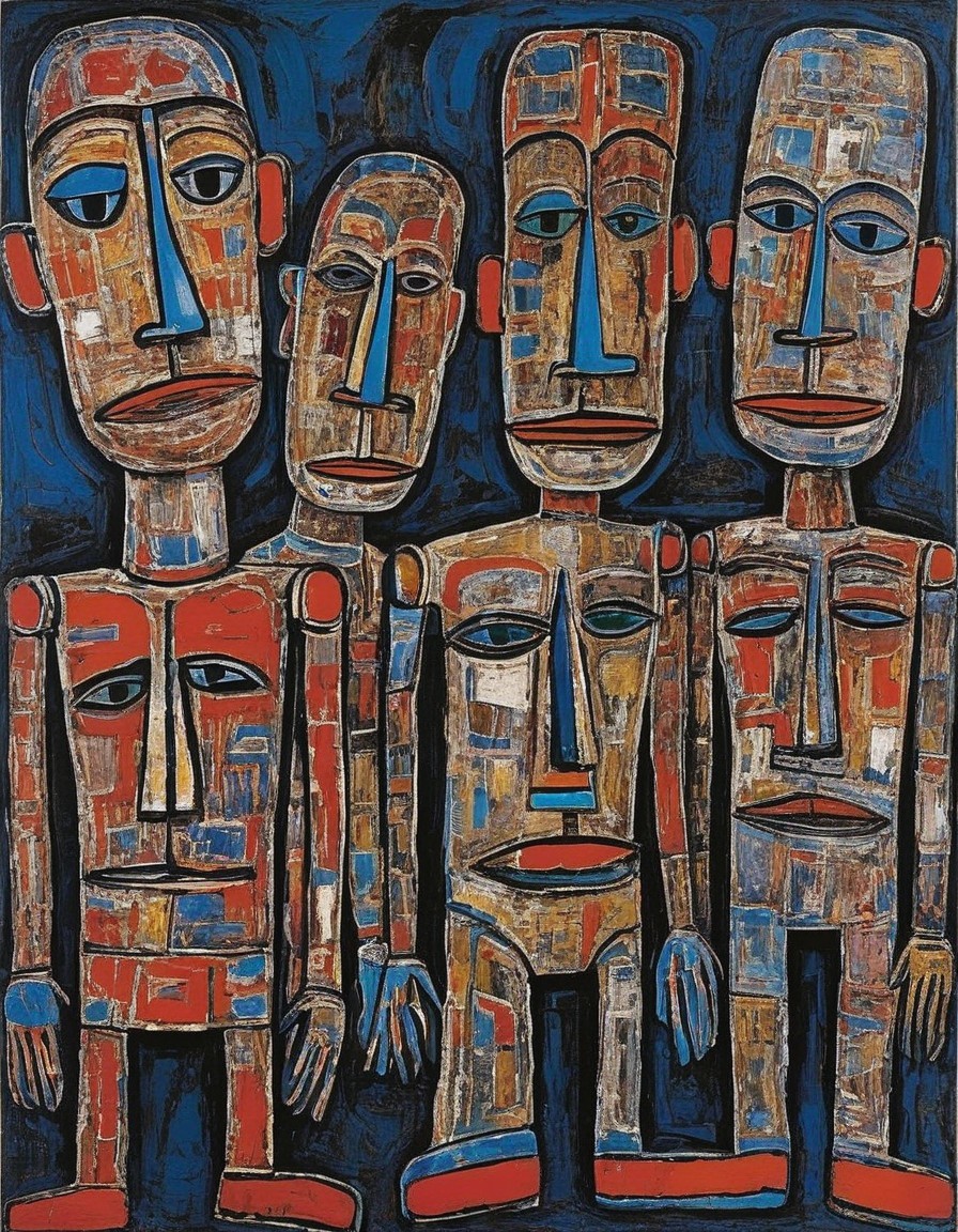 An abstract painting of five stylized figures with elongated faces, standing side by side against a blue background.