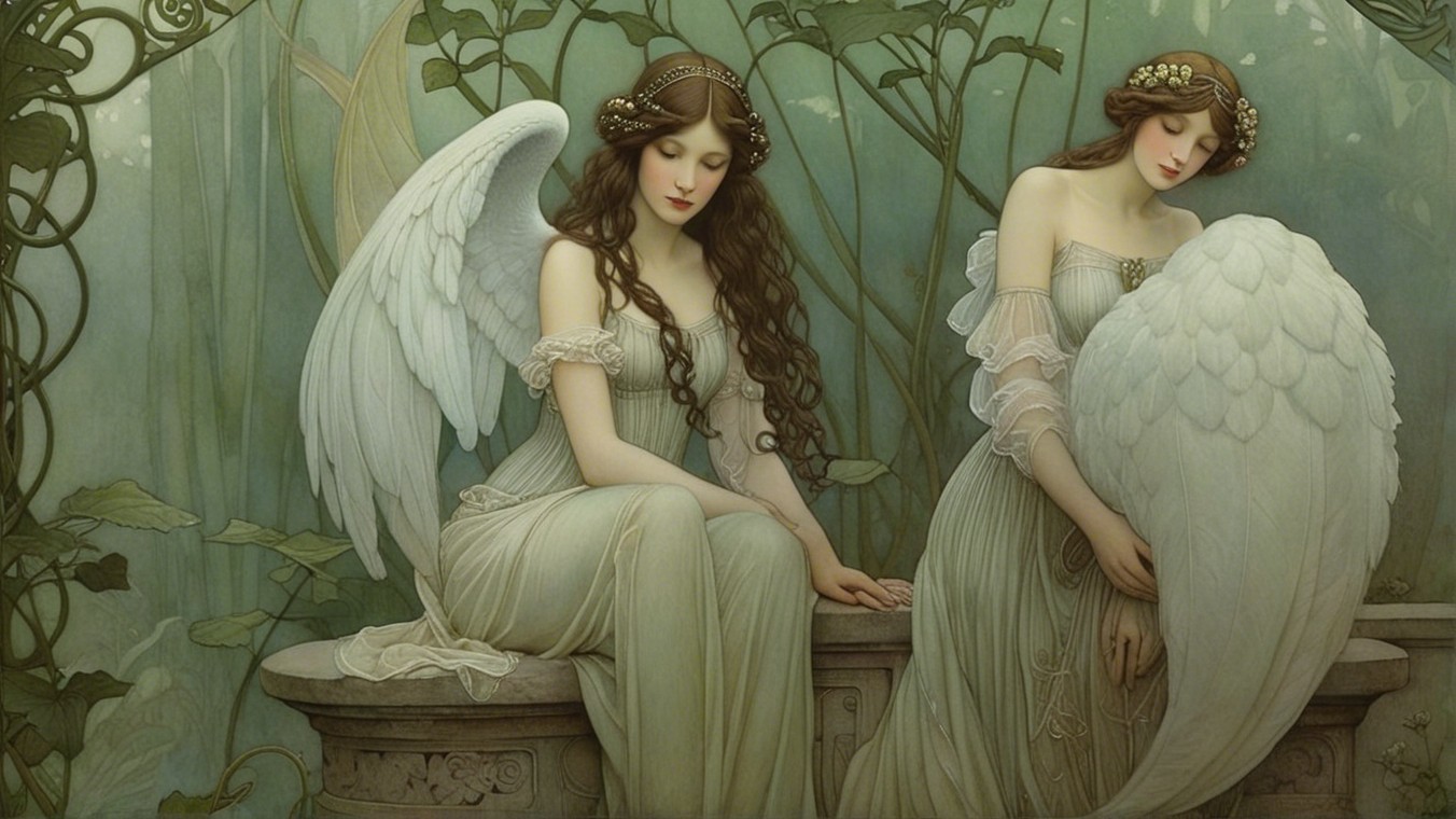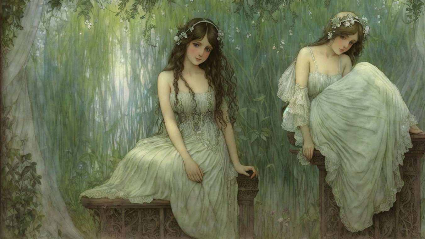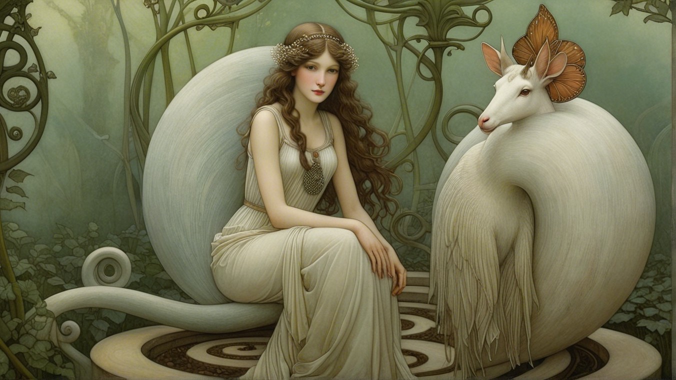 A serene young woman with flowing hair and a delicate crown stands amidst lush greenery, holding a large leaf, with a small bird perched on a textured pumpkin nearby. Dreamy and enchanting atmosphere.